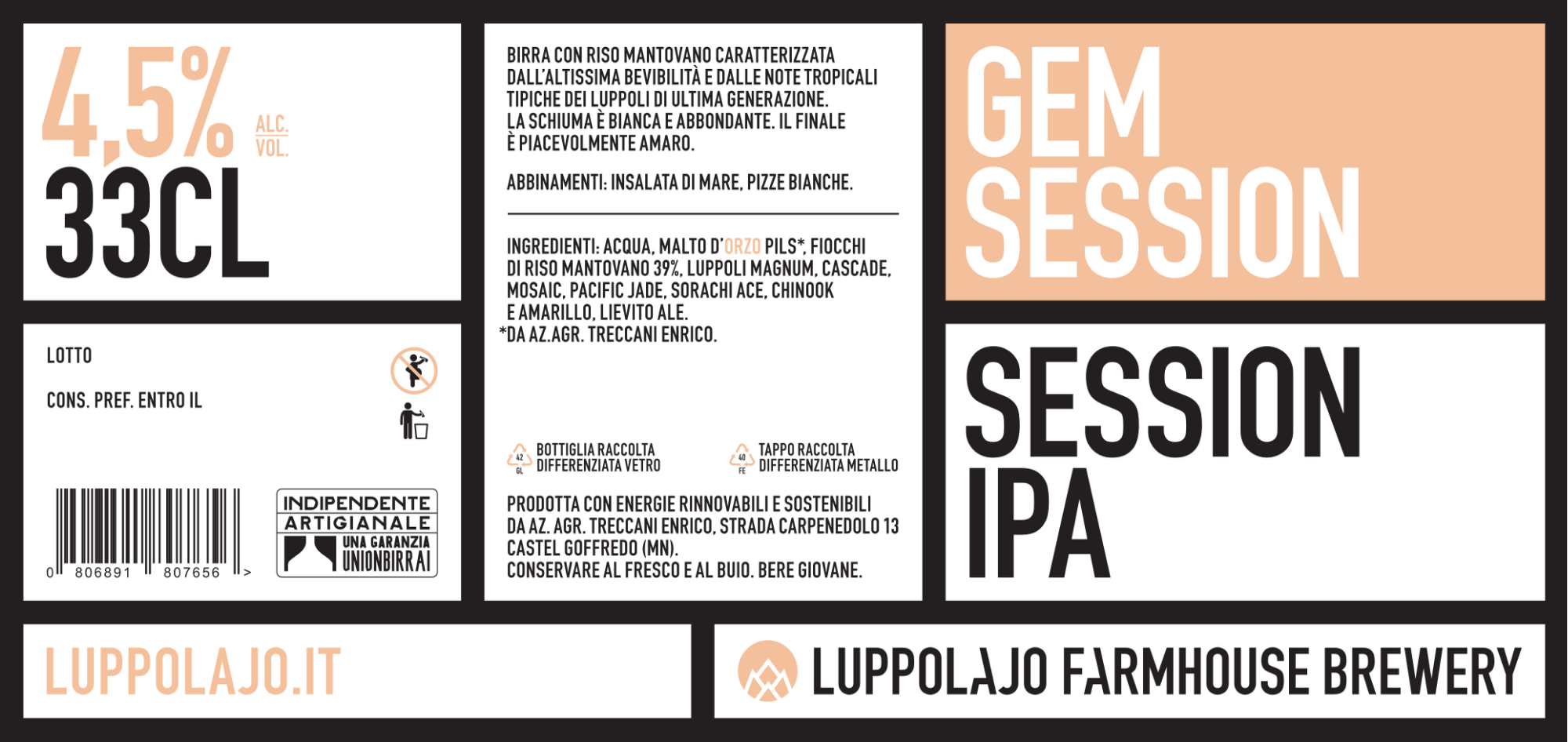 Birra con riso mantovano caratterizzata dall’altissima bevibilità e dalle note tropicali tipiche dei luppoli di ultima generazione. La schiuma è bianca e abbondante. Il finale è piacevolmente amaro.