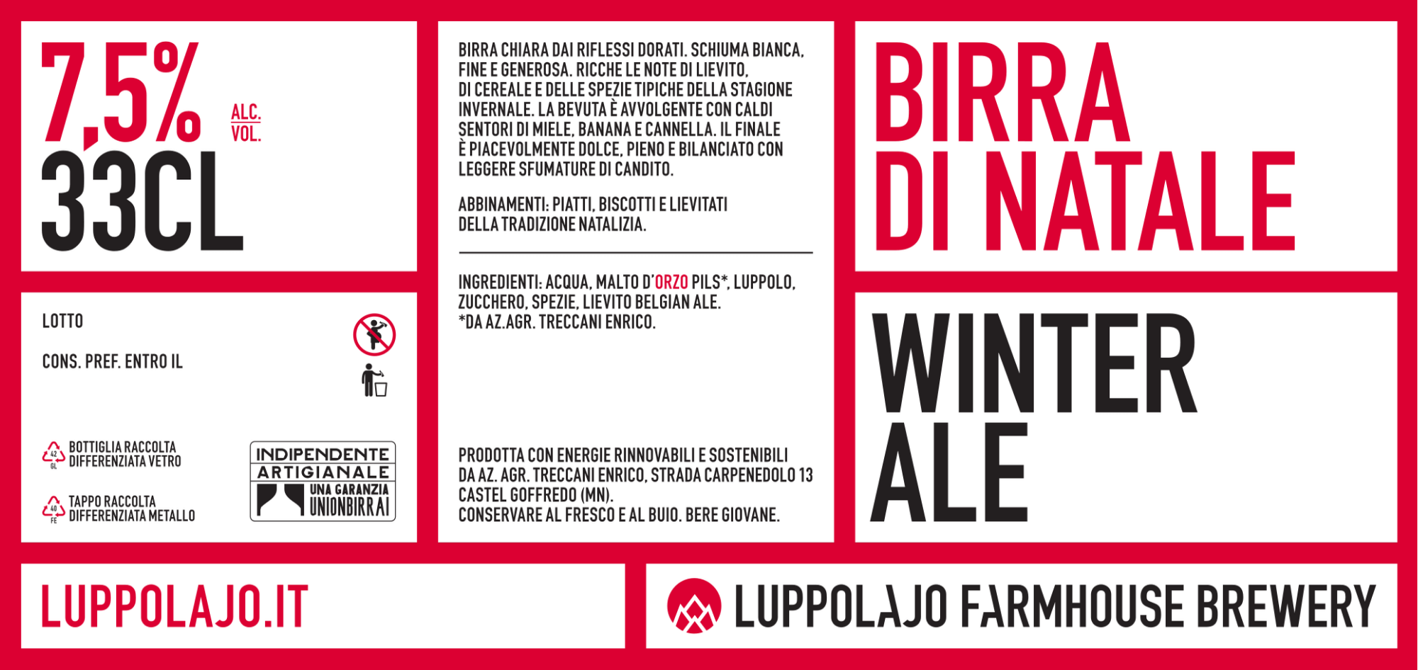 Birra giallo dorato limpida con schiuma bianca. Le note agrumate e di miele si sposano perfettamente con quelle speziate e floreali. L’inizio di bevuta è caldo e dolce. Il finale è leggermente amaro e molto lungo. L’intensità e la complessità del bouquet è perfetta per accompagnare le feste natalizie.